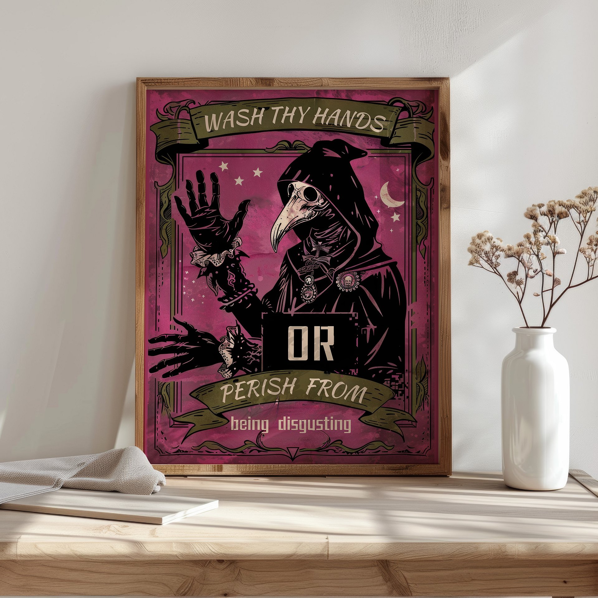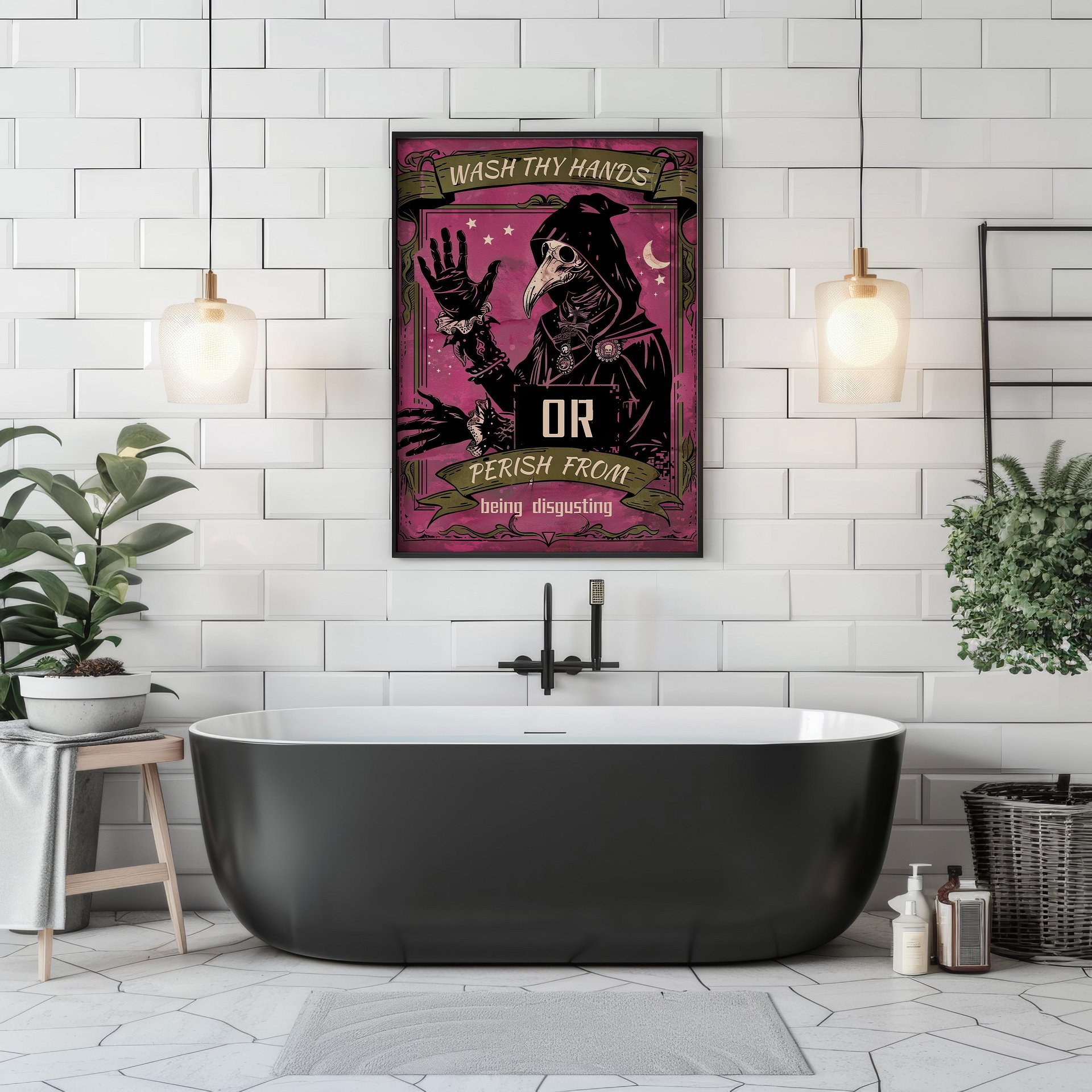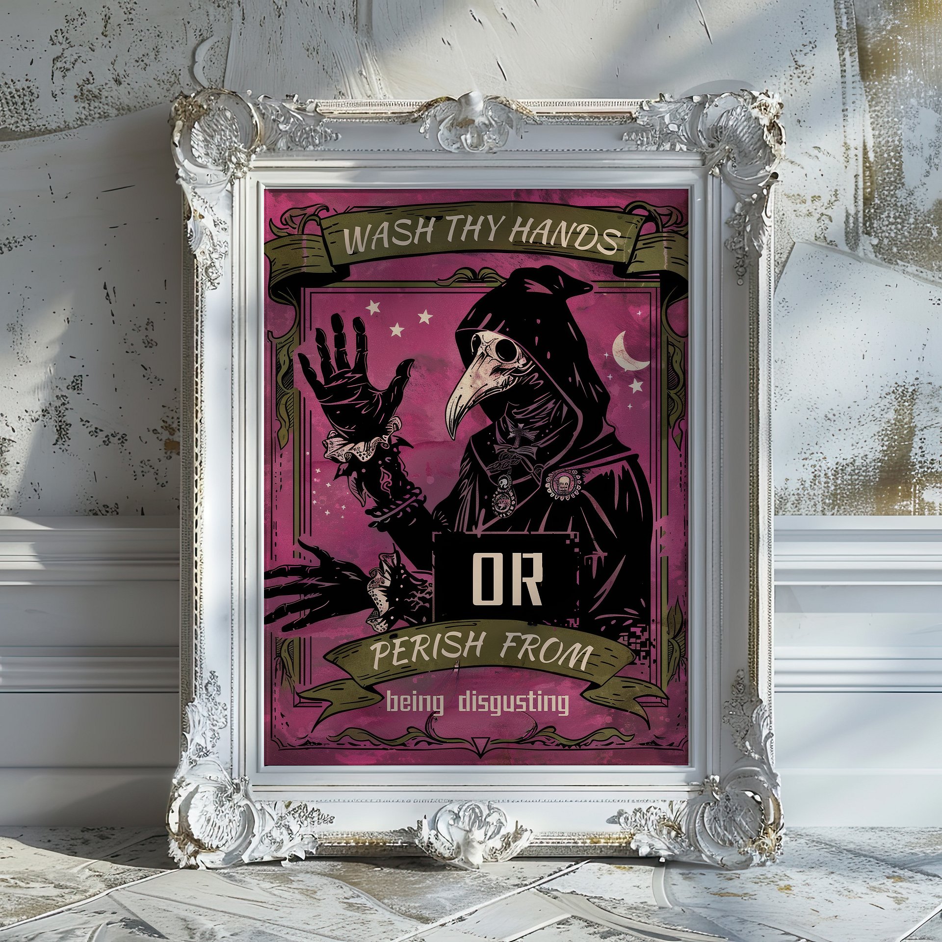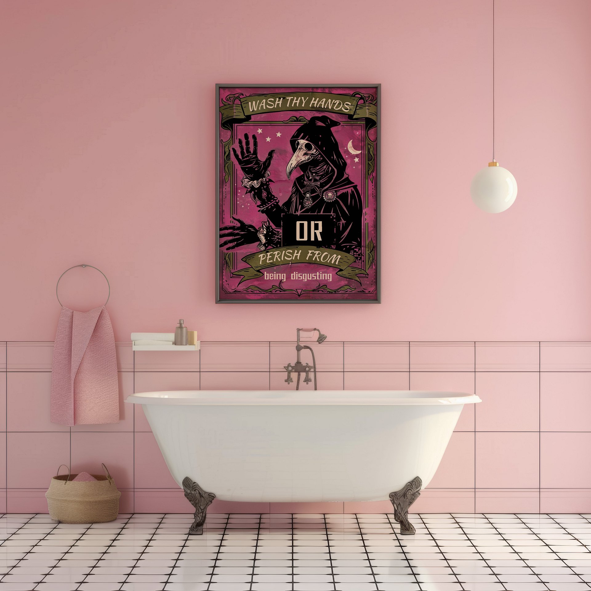 Featuring a classic black plague doctor, resplendent in black, with fuchsia background, the message is clear: Wash up, or face the consequences! The bold statement "Wash Thy Hands Or Perish From Being Disgusting" adds a touch of gothic whimsy to your bathroom decor, reminding everyone in a not-so-subtle way to scrub those germs away.