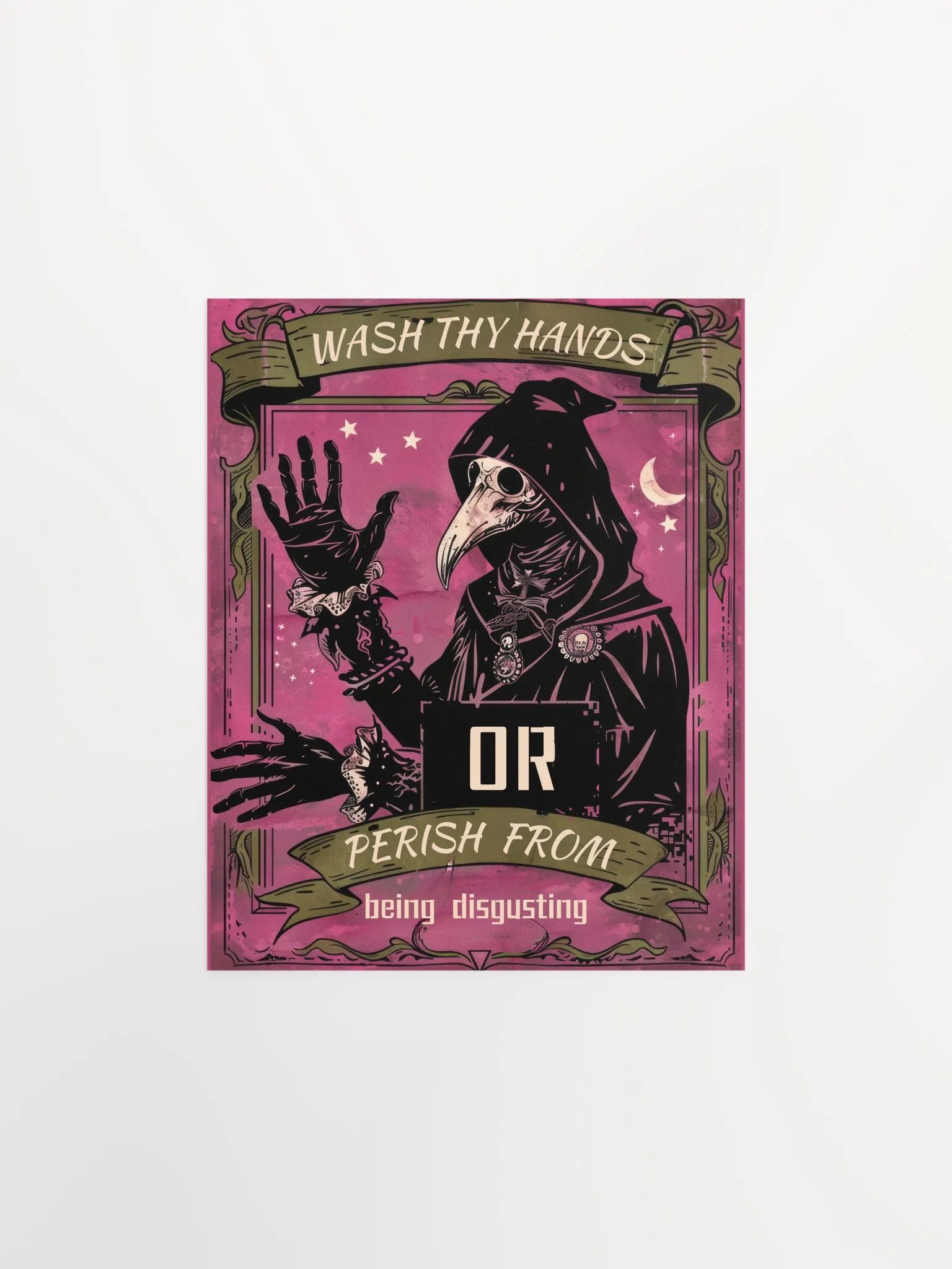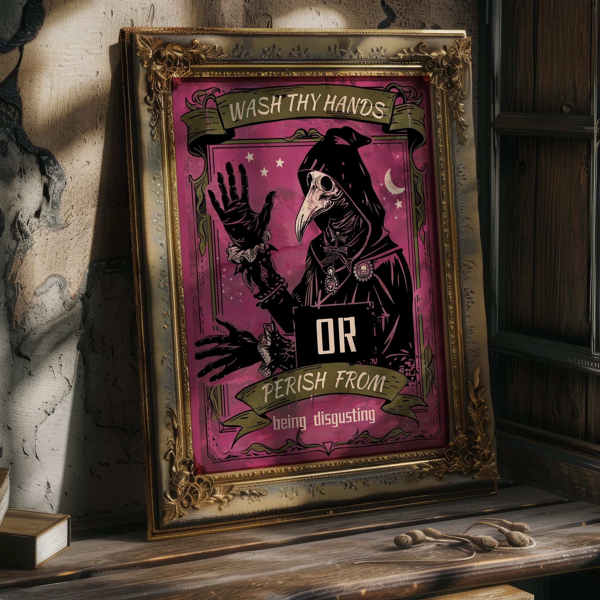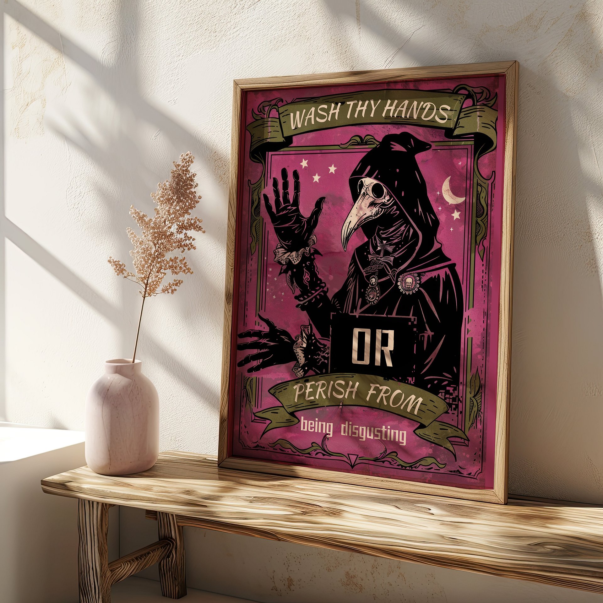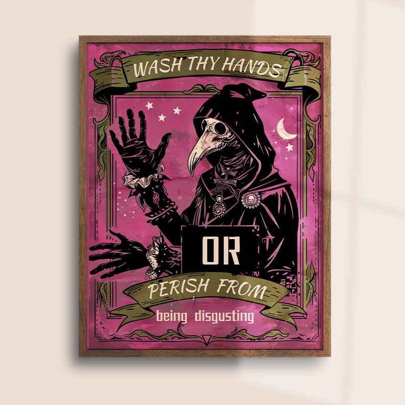 Featuring a classic black plague doctor, resplendent in black, with fuchsia background, the message is clear: Wash up, or face the consequences! The bold statement "Wash Thy Hands Or Perish From Being Disgusting" adds a touch of gothic whimsy to your bathroom decor, reminding everyone in a not-so-subtle way to scrub those germs away.